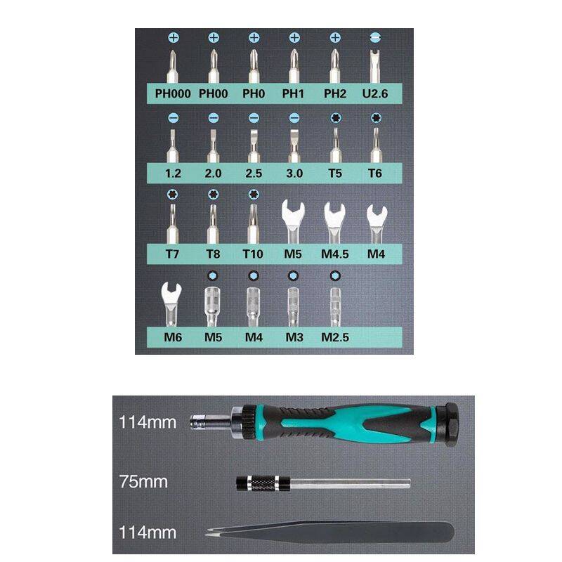 Descrizione: Set di utensili di precisione Proskit SD-9827 M con custodia con apertura PUSH, che consente anche l'apertura parziale della confezione