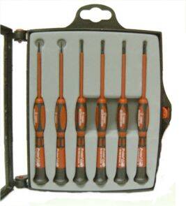 Descrizione: Set cacciavite professionale alta precisione isolati 1000 VAC norme VDE per 1000 VAC , CONFEZIONE SCATOLA 6 PZ ,a taglio e a croce lama acciaio cromo vanadio rifinite con cromatura satinata, testa a perno ad azione rotatoria.