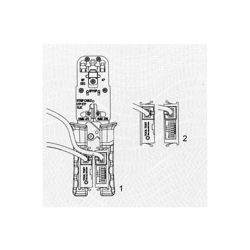 Crimpatura di cavo singolo o multifilo; permette di crimpare i seguenti plug modulari: 8P8C (RJ45), 6P6C (RJ12), 6P4C (RJ11); con spelafili e taglierina integrati.