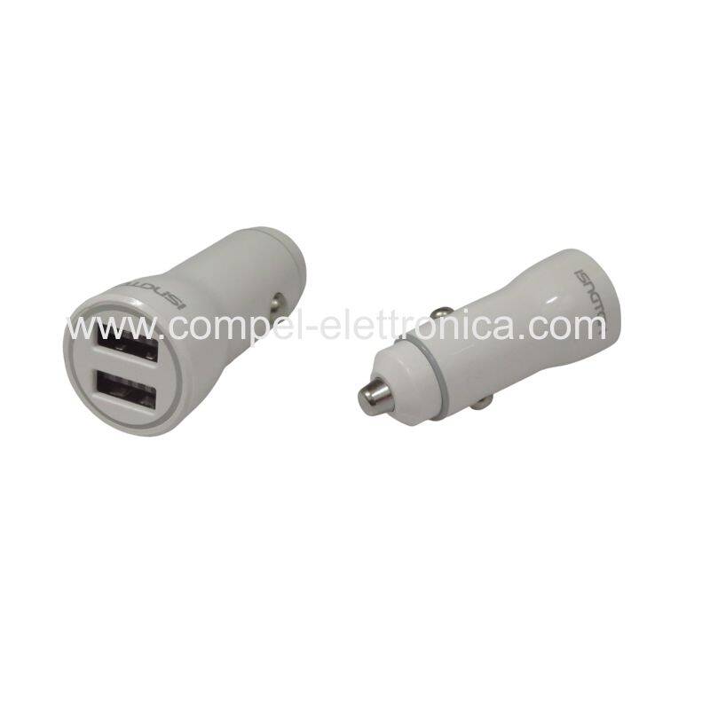 Alimentatore da auto con 2 uscite USB,adatto per Smartphone, iPhone, iPad, Tablet ed altri dispositivi USB. Ingresso 12/24Vdc, uscita 5Vdc. Corrente max per singola porta 2.4A, nel caso di utilizzo contemporaneo delle due porte l'uscita sarà 2.4A 2.4A.