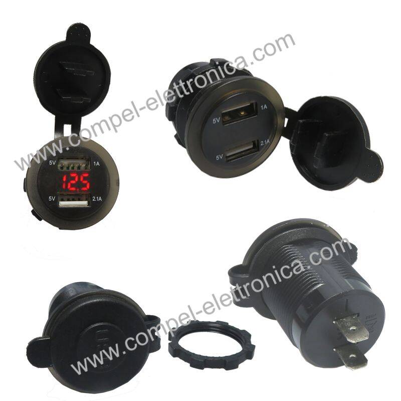 Descrizione: Doppia presa di alimentazione USB 5Vdc adatta a tutti i mezzi dotati di alimentazione 12Vdc ... 24Vdc, tipo moto, auto, barche, camper.