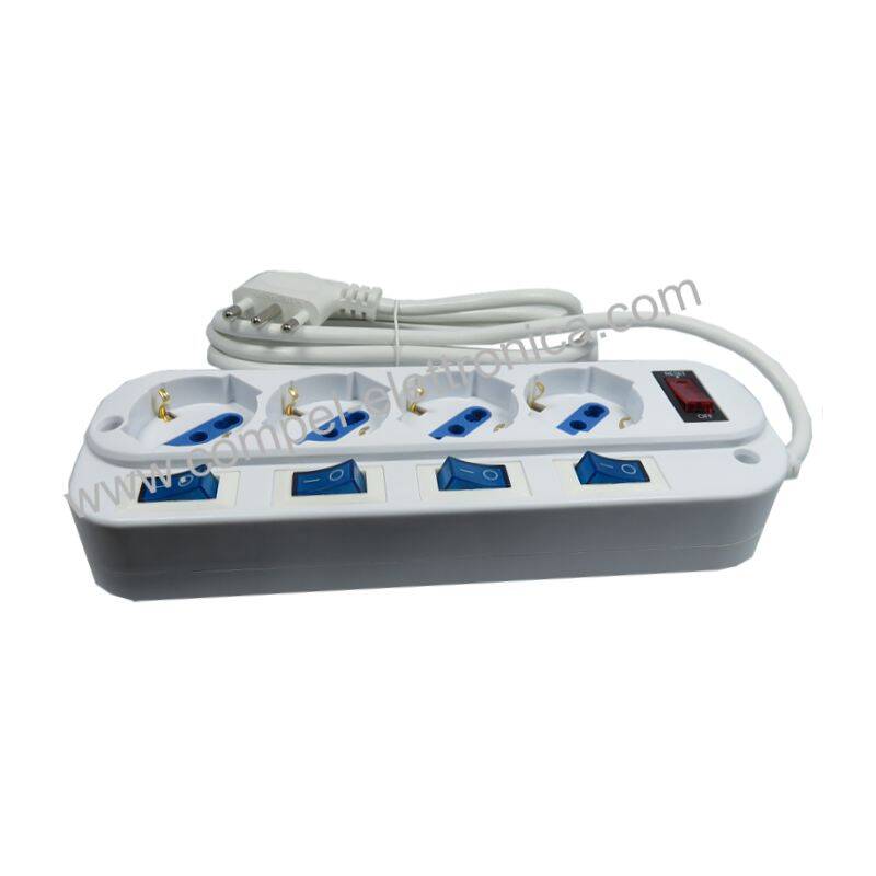 Descrizione: Prese multiple a 4 prese italiane bipasso 10/16A. Con interruttore generale luminoso e 6 interruttori luminosi per ogni presa .Prese con alveoli di sicurezza schermati.
