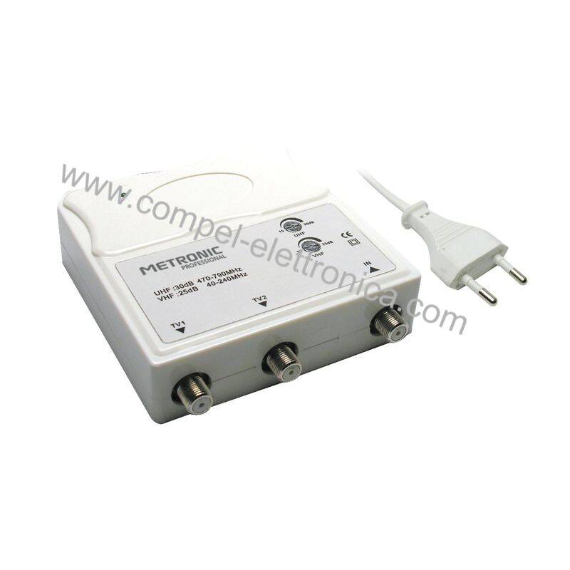 AMPLIFICATORE ANTENNA TV VHF UHF 1-IN 2-OUT 30DB FILTRO 5G REGOLABILE