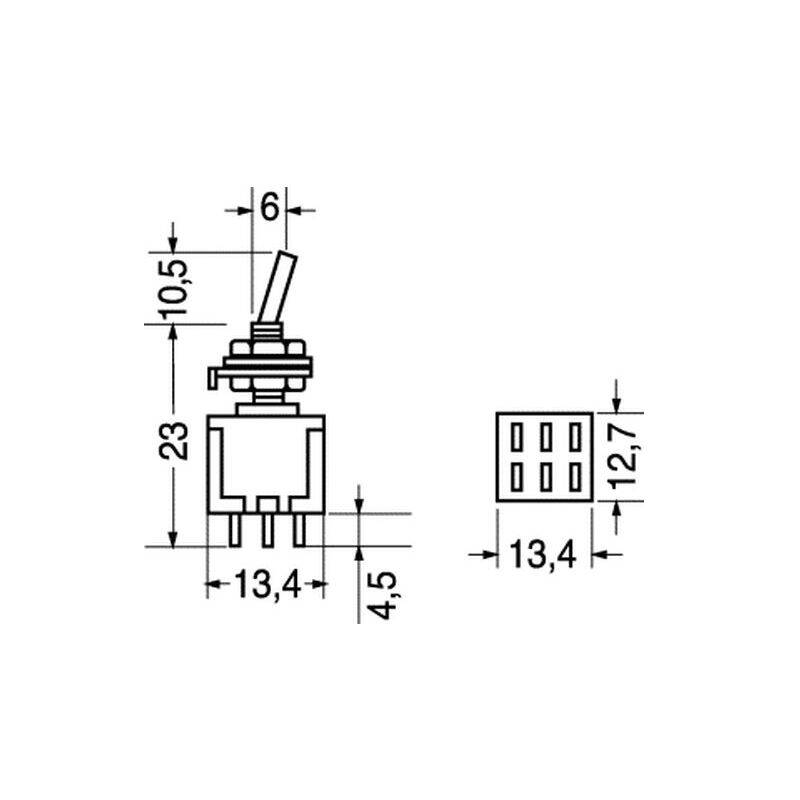 Descrizione: Deviatore miniatura - interruttore bipolare 2 scambi Posizioni 3 - stabile ON / OFF / ON
