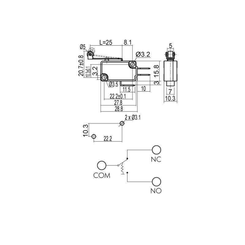 Descrizione: Microswitch ON-(ON) - micro commutatore SNAP ACTION CON LEVA LUNGA E ROTELLINA SPDT