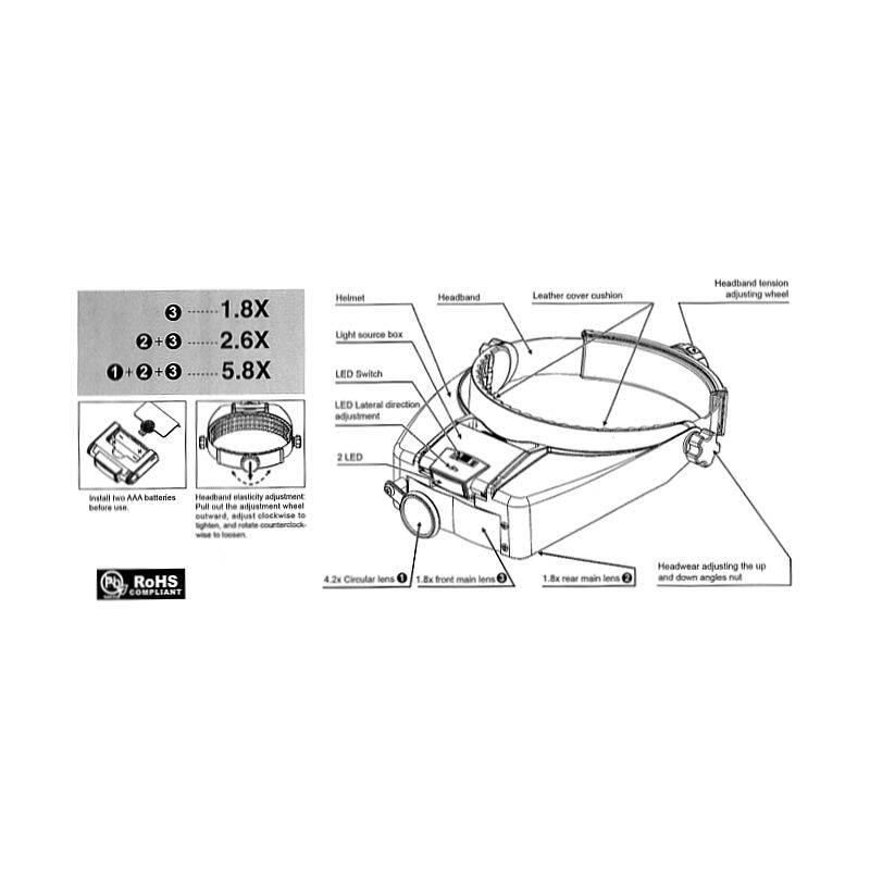 Descrizione: Lente d'ingrandimento a Visiera con monocolo 3 LENTI 1,8x 2.6x 5.8x PRO'SKIT MA-016