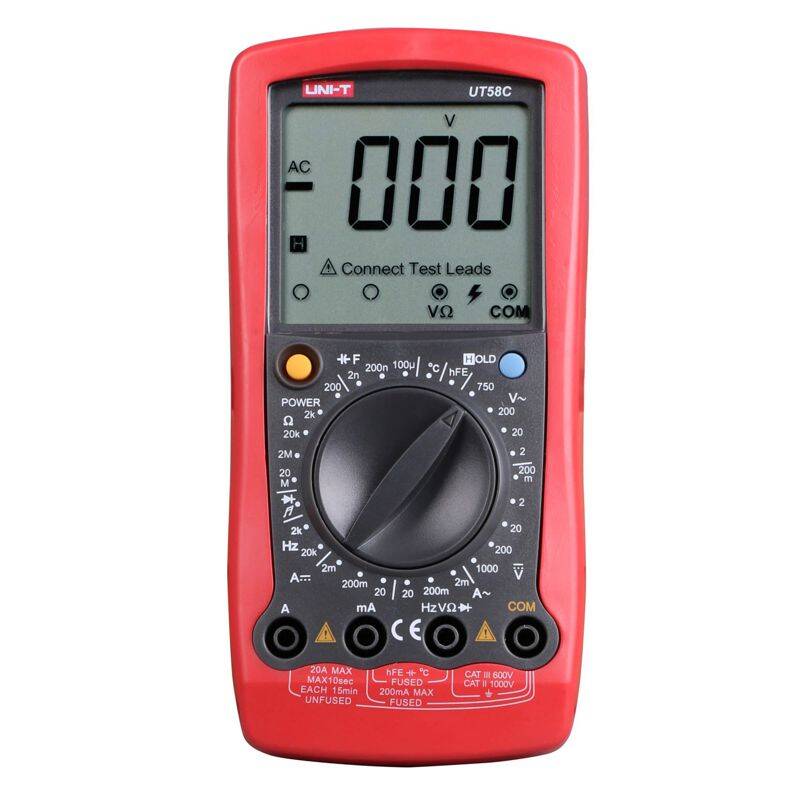 L'UT58C è un multimetro digitale versatile dal design classico in grado di misurare tensione CA/CC, corrente CA/CC, resistenza, capacità, frequenza e temperatura. È dotato di un ampio schermo LCD da 60 mm x 54 mm che può visualizzare fino a 2000 conteggi, semplificando la lettura dei risultati delle misurazioni. L'UT58C non ha solo una funzione di test dei transistor, ma anche una funzione di test di continuità e diodi con un cicalino. La funzione di spegnimento automatico preserva la durata della batteria, rendendola più durevole.